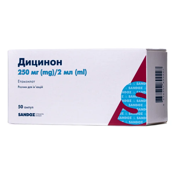 Этамзилат является средством для предотвращения и остановки кровотечения. Он влияет на первую стадию механизма гемостаза (взаимодействие между эндотелием и тромбоцитами). Дицинон повышает адгезивность тромбоцитов, нормализует устойчивость стенок капилляров, снижая таким образом их проницаемость, ингибирует биосинтез простагландинов, которые вызывают дезагрегацию тромбоцитов, вазодилатацию и повышенную проницаемость капилляров. В результате этого период кровотечения значительно уменьшается, кровопотеря снижается.