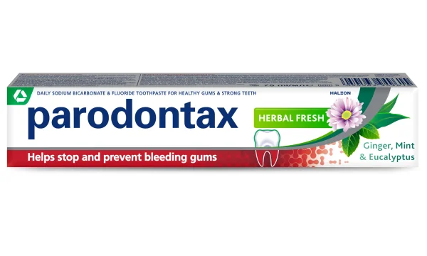 Зубная паста Parodontax Свежесть трав помогает остановить и предупредить кровоточивость десен благодаря удалению скопления бактерий — главной причины кровоточивости десен, для здоровых десен и крепких зубов.
